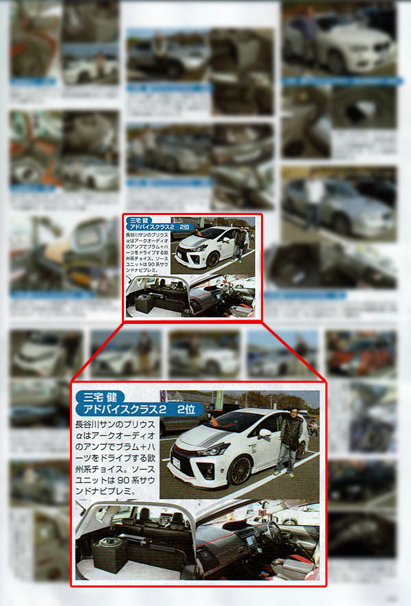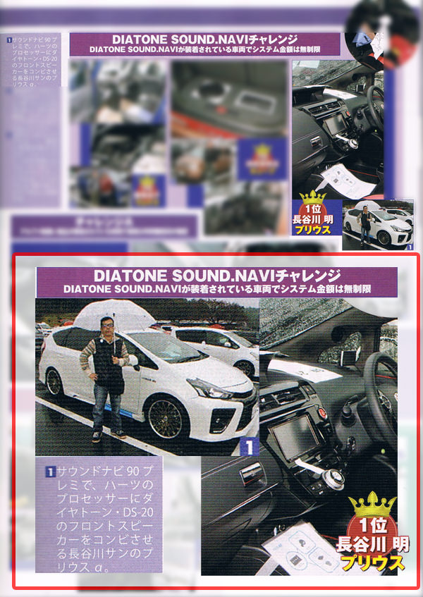 カーオーディオマガジンに2015アルファサウンドミーティングin関東・DIATONE SOUND.NAVIチャレンジクラス(システム金額無制限)にて第1位を受賞したお客様のプリウスαが掲載されました。