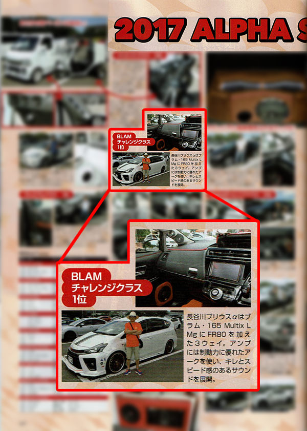 カーオーディオマガジンに2017アルファサウンドミーティングin関東・BLAMチャレンジクラスにて第1位を受賞したお客様のプリウスαが掲載されました。
